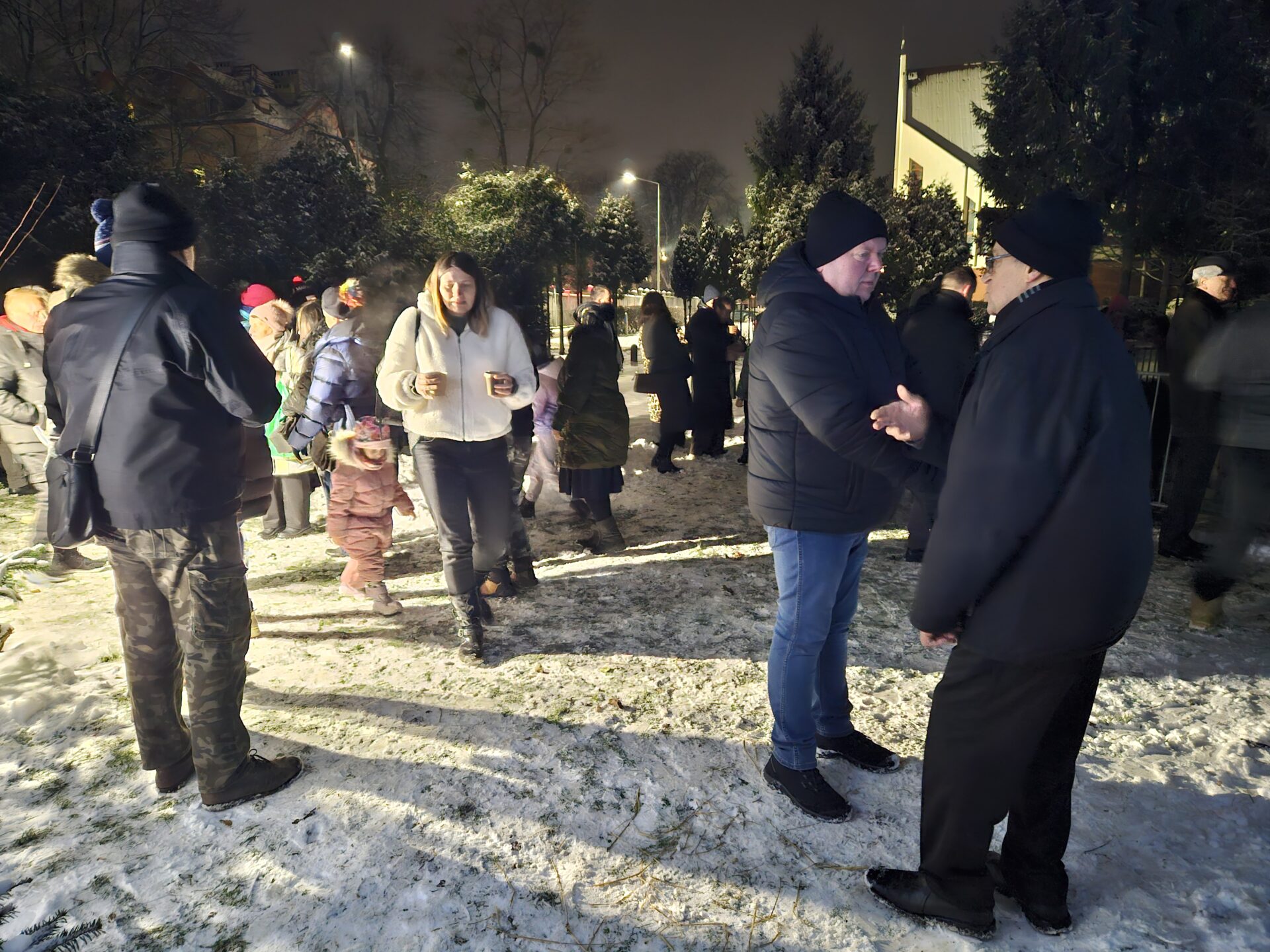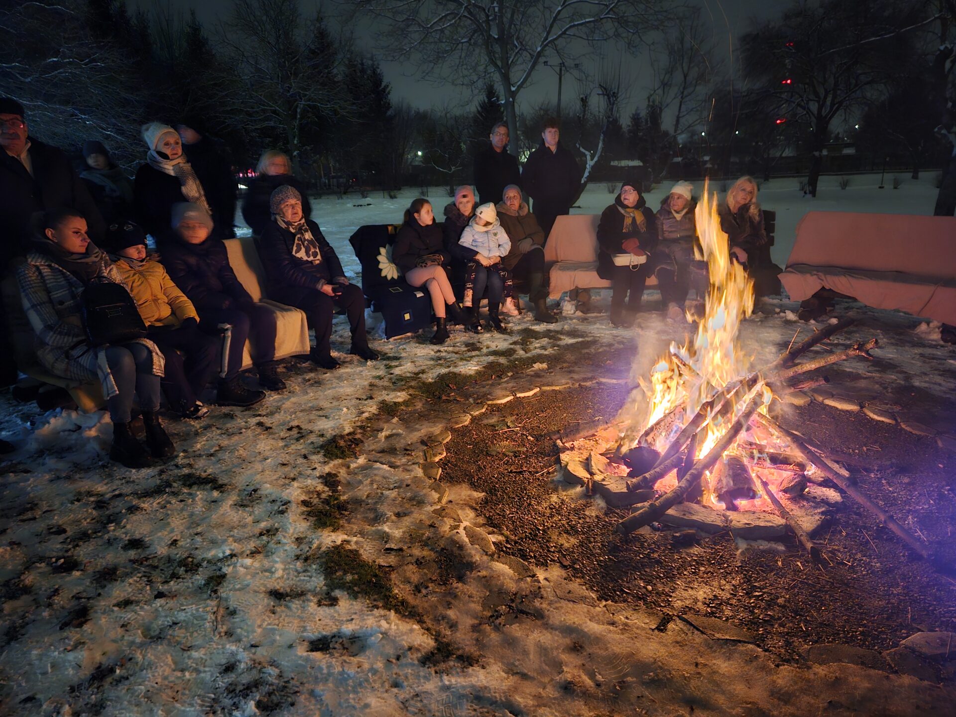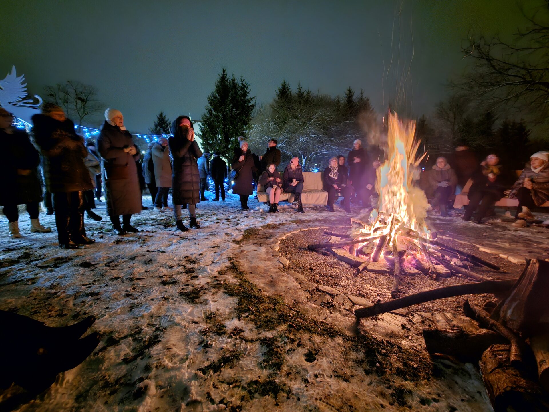 Po części artystycznej wszyscy uczestnicy udali się do ogrodu przy DPS Caritas, gdzie odbyło się wspólne kolędowanie przy ognisku. Ciepło płonącego ognia, dźwięk kolęd, gorąca herbata oraz serdeczne rozmowy stworzyły niepowtarzalny klimat bliskości i radości. Szczególną atrakcją wieczoru było spotkanie z alpakami, które wzbudziło ogromne zainteresowanie i uśmiech. Bezpośredni kontakt ze zwierzętami okazał się źródłem radości, spokoju i pozytywnych emocji, zwłaszcza dla osób z niepełnosprawnościami oraz dzieci.